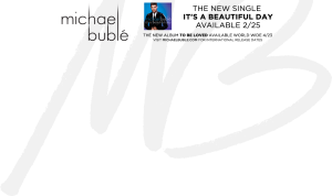 Now that all three video previews have been released, with the third being posted early Tuesday afternoon, Bublé is set to premiere his new single, “It’s A Beautiful Day,” which will be revealed on michaelbuble.com sometime later today (Wednesday). According to a storage site used by the record company to test their artists’ websites in a development environment, the splash page currently greeting visitors to the website will be replaced with a playlist of the three videos, as well as the background image shown below, in which details on the song and album titles are revealed. “It’s A Beautiful Day” will be the lead single from Bublé’s album To Be Loved. The album is set for a worldwide sale date of April 23 following the release of “It’s A Beautiful Day” this coming Monday, February 25. The song has yet to be revealed in full, but due to the pop-friendly production heard in the previews thus far, expect the song to receive treatment as a single for pop and adult contemporary radio formats.